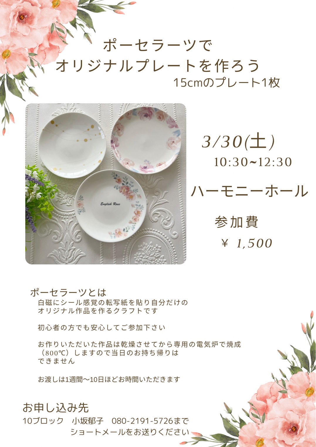 開催日 2024年3月30日(土) 10:30から12:30 洋室にて参加費 直径15cmのプレート1枚 1500円
